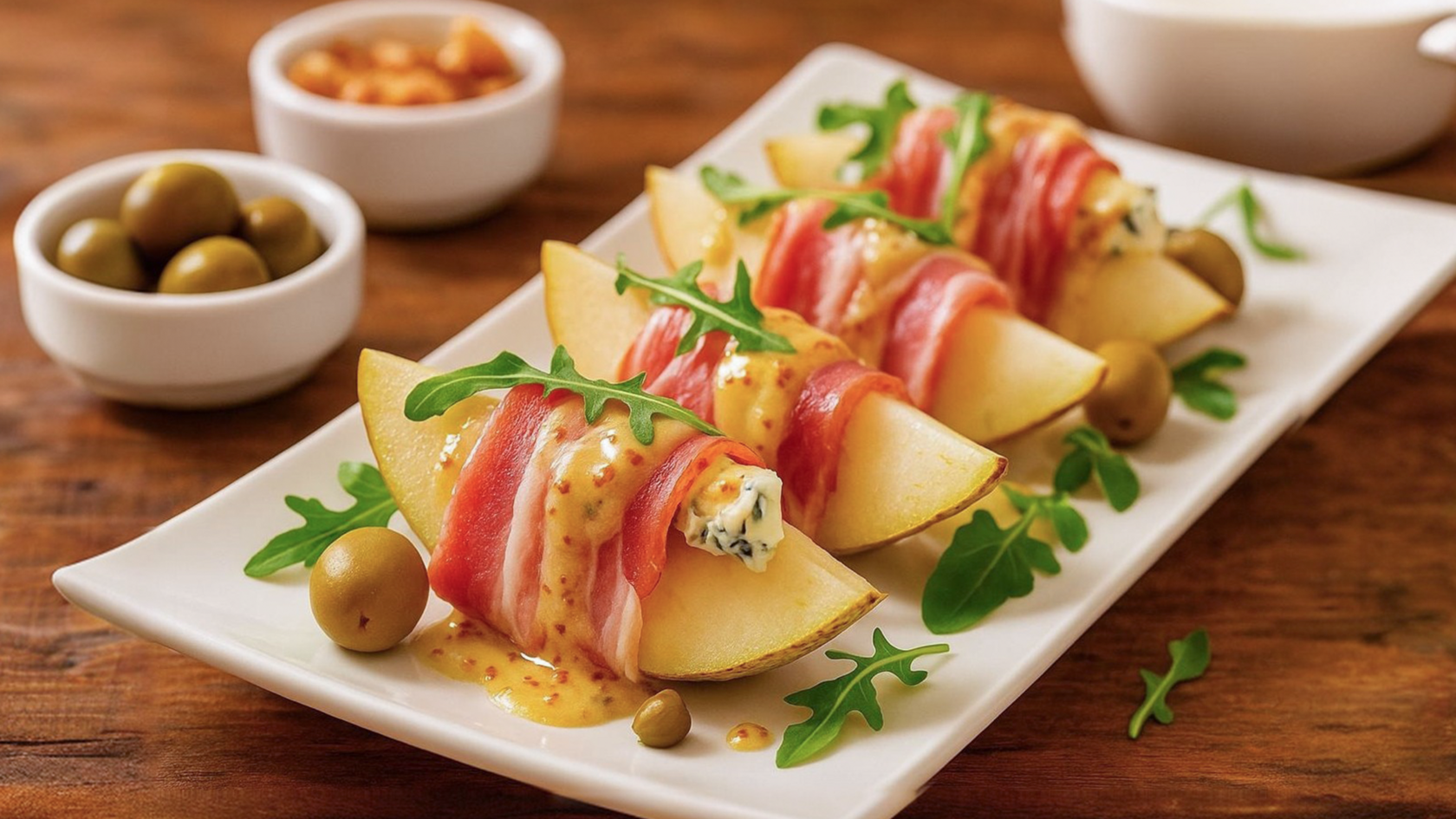 На сервировочную тарелку выложить груши веером, на каждую четвертинку груши положить по ломтику бекона и кусочку сыра. Сверху полить соусом.