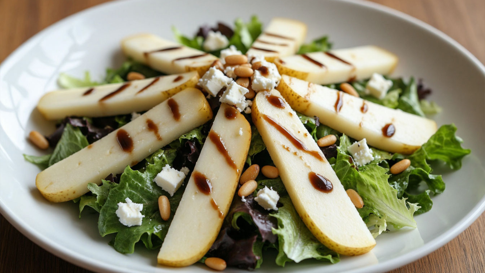 В миске смешиваем листья салата, грушу и кедровые орешки, заправляем салат солью и оливковым маслом.