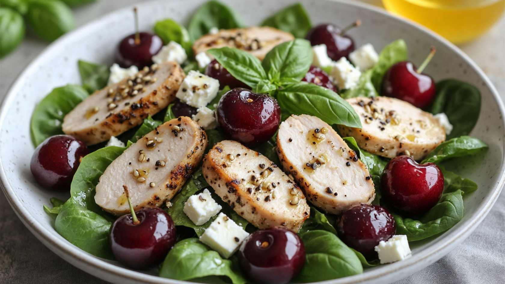 Листья салата порвать, поместить в миску. Добавить индейку, семена чиа, аккуратно перемешать. Посыпать сыром фета, черешней, кусочками лимона, заправить оливковым маслом. Украсить листьями базилика. Важно! Подавать сразу, пока индейка не остыла.