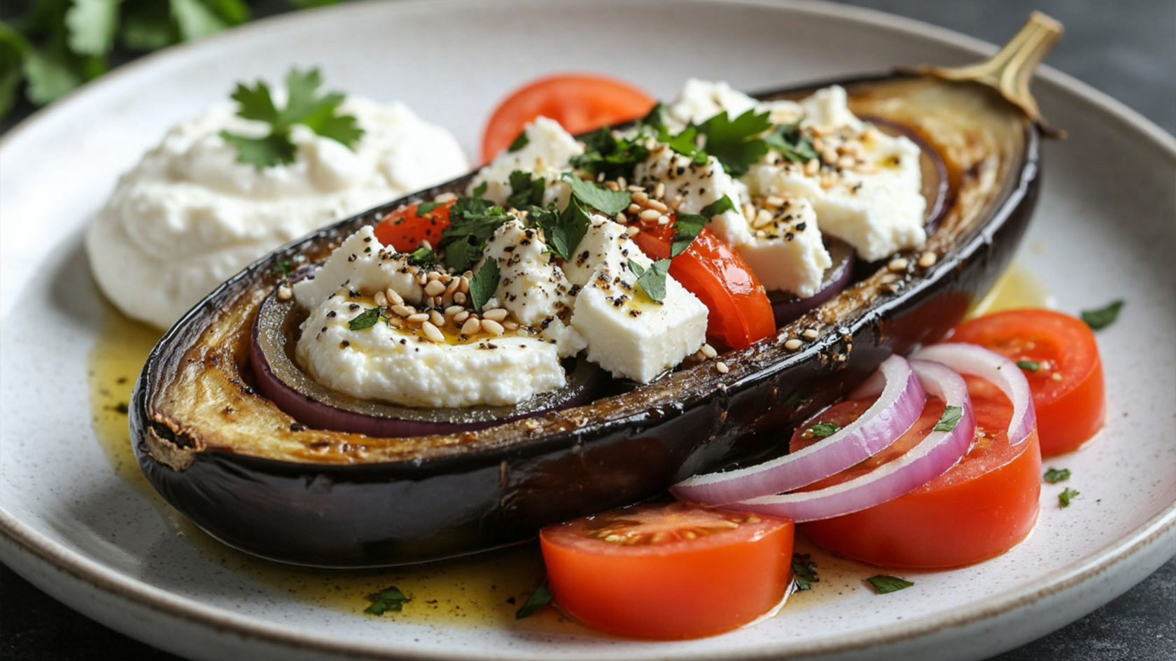 Запеченный баклажан не до конца разрезать пополам, раскрыть и посолить. На него уложить томаты с луком, с помощью двух ложек сделать шарик из сырного крема, украсить кунжутом и кинзой.