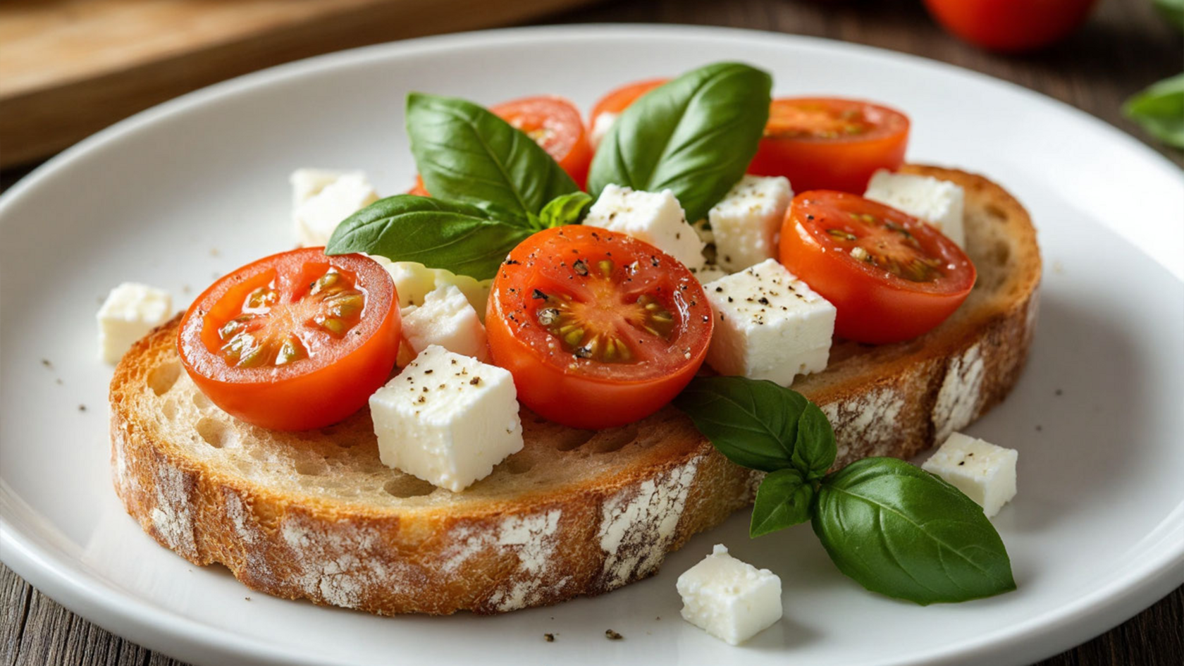 На поджаренный хлеб намазать чесночную массу, сверху уложить нарезанные пополам помидоры черри, кубики феты, украсить листьями базилика.